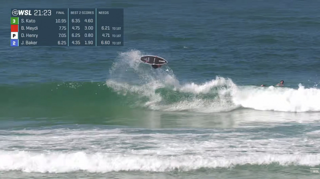 ヒート序盤はミラが6.00、7.00を出して主導権を握っていた。アイラは2度のミスの後、7.50を出して追い上げると残り13分で5.85を重ねて0.35ポイント差でトップに立ち、そのまま逃げ切ることに成功した。