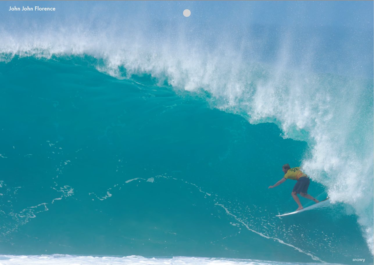 子供のころから慣れ親しんだパイプ、バックドアのピークでサーフィンしているジョンジョンを見ると、本当に心から遊んでいる感じというか、攻めているけど余裕というか、緊張感がなく、リラックスしている感じ。今、この写真の瞬間も、次の瞬間には自分はこのバレルの奥のほうに位置するからスピードはこんな感じかな・・・みたいな、すべてわかっていて計算できていて、対応できている感じ。この降ってくるリップラインのどこが出口なのかもわかっていて、視線はしっかりそこを見ている。そりゃかなわないよなぁ、と思わせる選手のひとり。