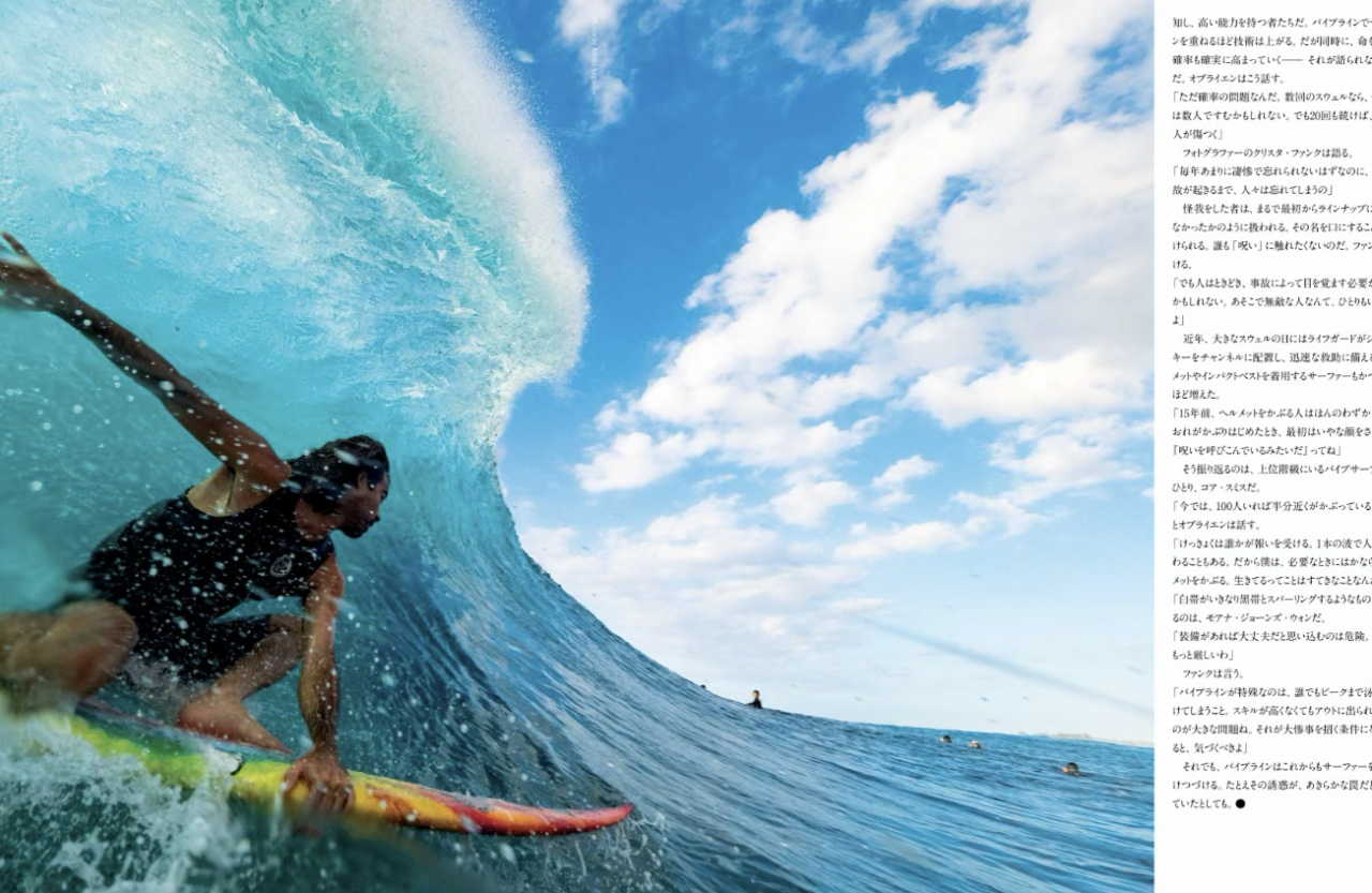 パイプラインの混雑ぶりは、いまさらですが壮絶です。文中では簡単にパドルウアトできるから、そこが問題なんだって言ってますが、そんなことないです。パイプでのパドルアウトは、本当に大変ですよ。タイミングひとつ逃したら出られません。インサイドでボードが真っ二つなんてこともありえます。さて、この記事はパイプラインでのヒエラルキーというか序列について語られています。顔ぶれがかなり変わったようですね。ヘルメット着用率も増えているみたい。パイプラインでワイプアウトの瞬間を、間近で目撃すると心臓が止まります。