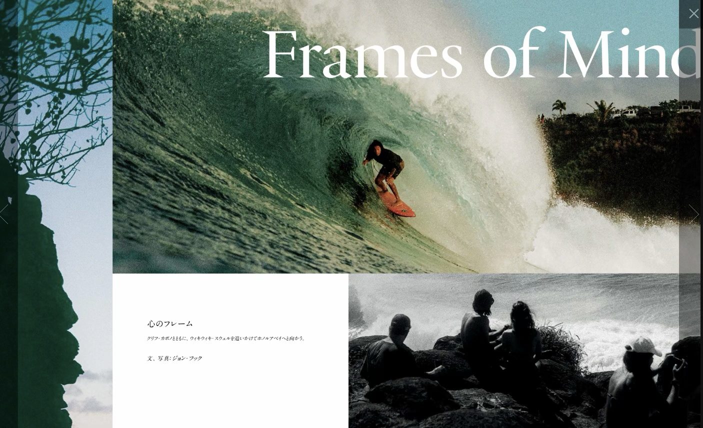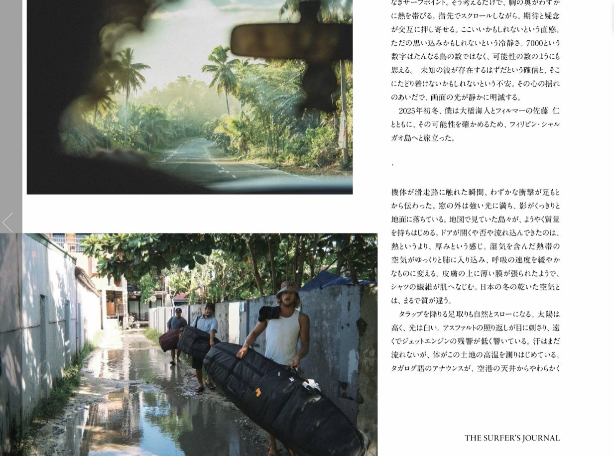 大橋海人は、最近フランスで優勝したんだよね。おしゃれです。そんな彼がフォトグの高橋賢勇と向かったのがフィリピンのシャルガオ島。 となるとクラウド9のバレル狙いとなりますね、みごと当てたようです。美しい逆光のバレルと、ハードボイルドタッチな紀行文が、まるで一緒に旅をしているような錯覚に陥ってしまいます。 良い波とフォトグ&サーファーのパフォーマンス。それらが過不足なく揃うことで、この記事は成立している。