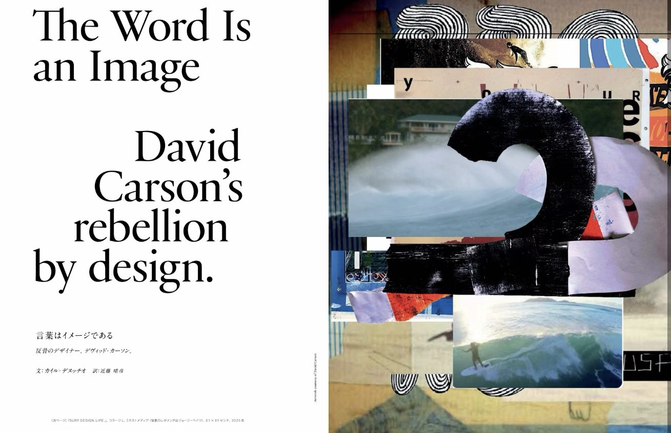 さてデビッド・カーソンはプロサーファーという経歴を持ちながら、グラフィックデザインのアートディレクターとして大成功しました。この人のすごいのはデザインにおけるタブーを無視したところかな、彼が手がけた本は、ページをめくるたびに新鮮な驚きがあってワクワクしたものです(これは筆者の個人的な感想)。かつては米国SURFERのアートディレクターを担当したこともあって、「なんか急に格好良くなったな~」と思ったらそのデザインがこのカーソン氏でありました。今回は彼の最新作品が網羅されています。いかがでしょうか? 作品についての評価はそれぞれだと思いますが、この人は、やはりあるていどの制約があった方が良い作品を生み出すと思う。だからSURFERを飾ったこれまでの作品を、この記事でもっと登場させてもよかったんじゃないかな~。もしかしたら本人がそれを嫌がったかもしれない…「最新の作品を出せって」てね。彼がデザインしたマット・ワルショー著「マーベリクス」とか最高だったなあ。