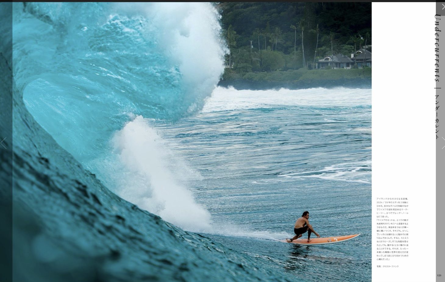 巨大なワイメアでボトムターンを決めるマーク・ヒーリー。写真に撮ると、波って小さく見えてしまう不思議がある。だからこのショットは相当なものですね。何ミリのレンズで撮ったかわからないけど、このポジションからって…すごいです。