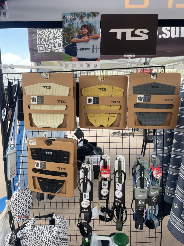 幅広いサーフィン用アイテムを取り扱うワンワールドのブースでは、TLSより新柄のポンチョ、新素材のトラクション、進化したリーシュコード等がラインナップ。中でも推しの新商品は、コナー・オレアリーのシグネチャートラクション。グリップ力や軽量性といったTLSらしい基本性能はそのままに、彼のフィードバックを受けてテール側の形状を変更。幅広いボードサイズにフィットする仕様へと進化した。