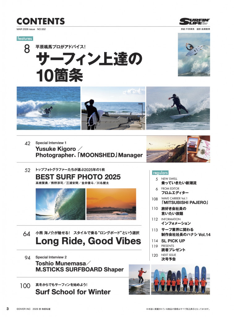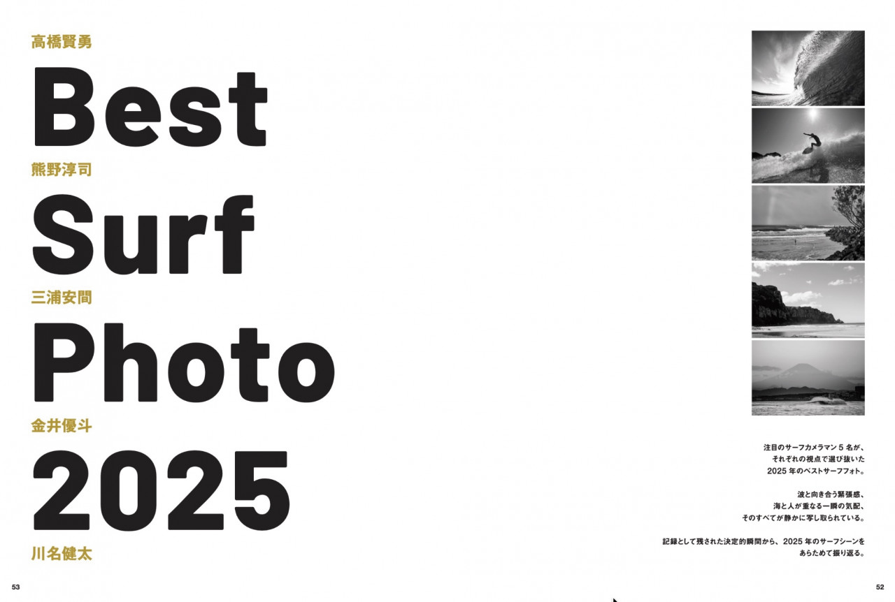 他にも「BEST SURF PHOTO 2025」では高橋賢勇/熊野淳司/三浦安間/金井優斗/川名健太の写真を掲載。Long Ride,Good Vibesでは小熊海ノ介が魅せる“ロングボード” という選択でサーフィンライフがさらに充実。