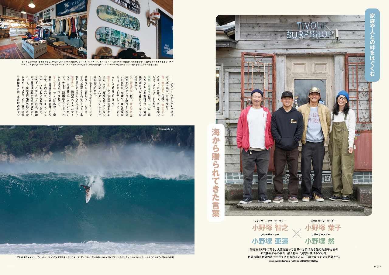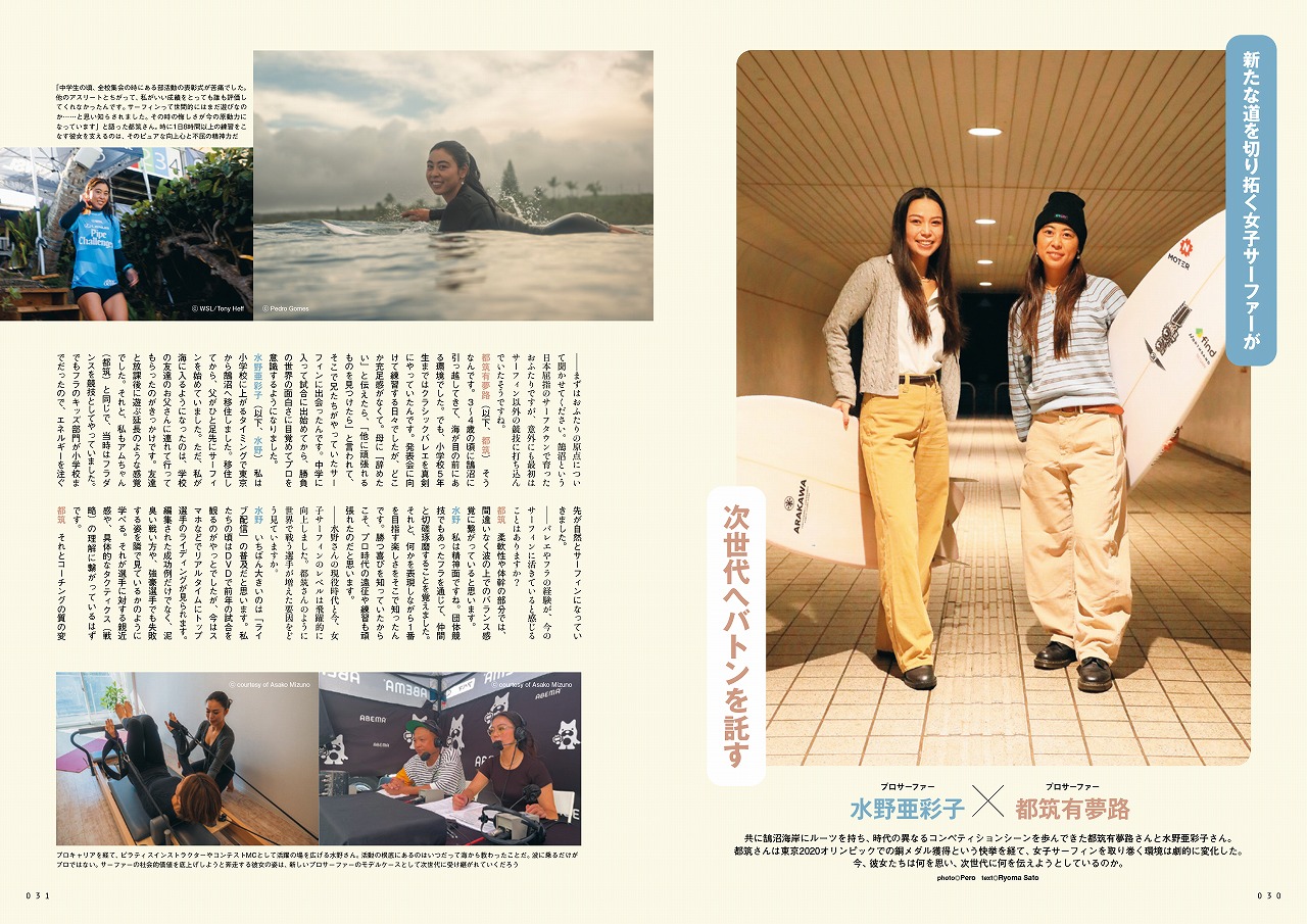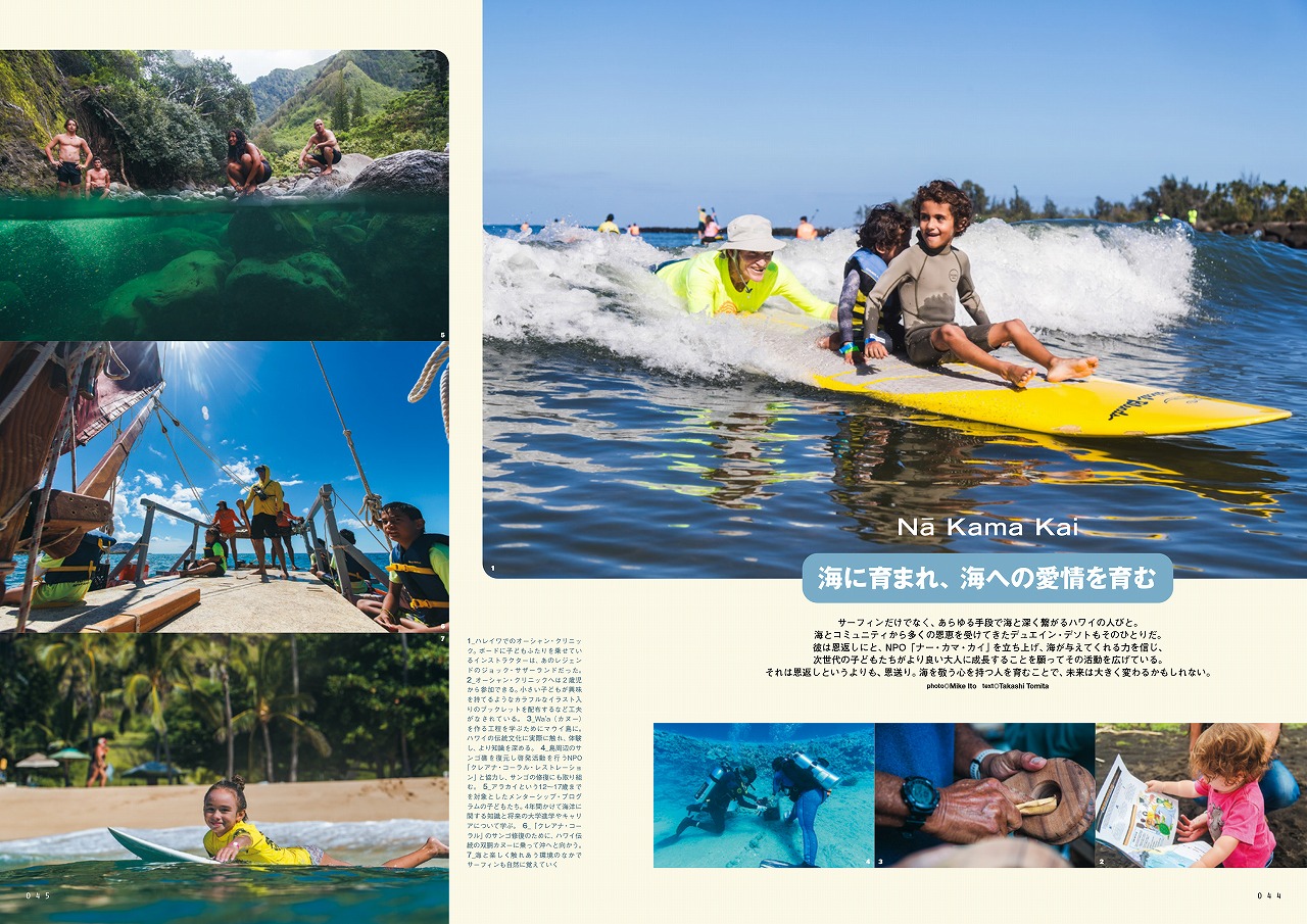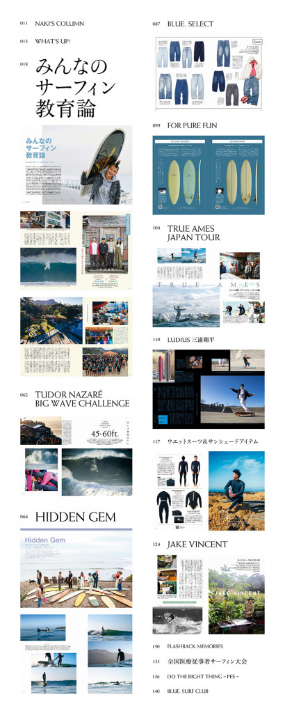 巻頭特集はBlue.流の「サーフィンと教育」をテーマに様々なスタイルのサーファーをピックアップしている。