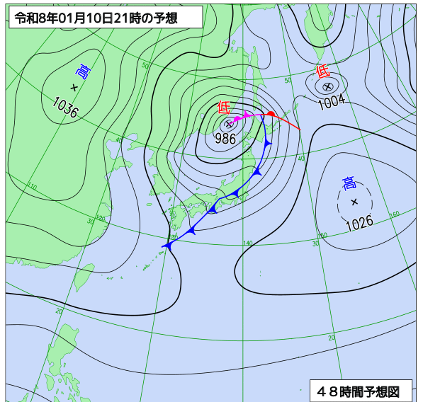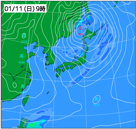 11日の日曜には北海道の北西海上からオホーツク海へ移動し、12日の成人の日にかけて冬型の気圧配置が続く予想。