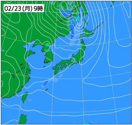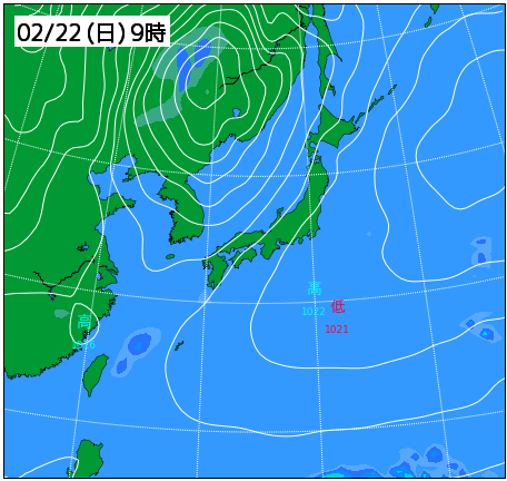 天皇誕生日を含む連休中、春一番が吹くような気圧配置となり、南よりの風が強まって気温が上昇する予報。