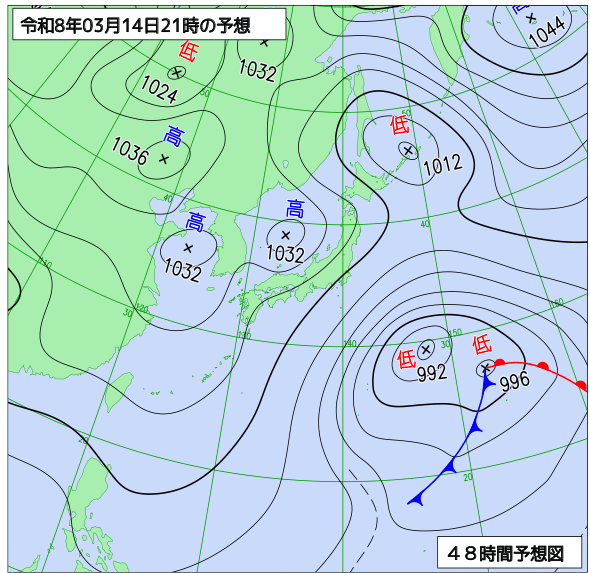 今週末は発達した前線を伴った低気圧が本州の南海上から東へ抜ける予想。