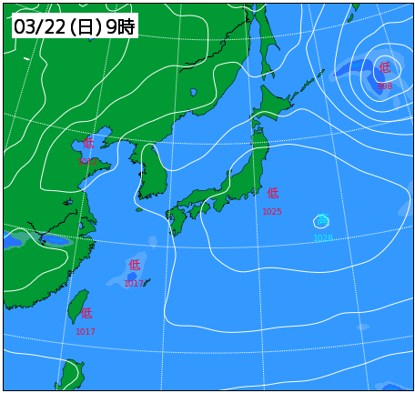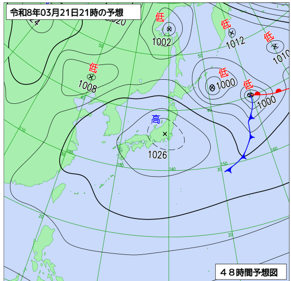 春分の日は低気圧や前線が通過、21日の土曜は高気圧に覆われ、22日の日曜は房総半島沖に弱い低気圧が発生する予想。