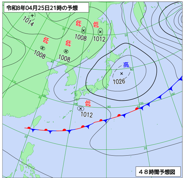 今週末は高気圧の中心が三陸沖から東へ移動する一方、前線が本州の南海上に延び、低気圧が西日本の南海上を移動する予想。