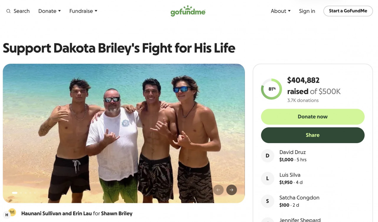 ダコタを支援するため、ノースショアのコミュニティはクラウドファンディングサイト GoFundMe やインスタグラムアカウント @prayfordakotabriley を立ち上げ、寄付を募った。これまでに約40万ドルが集まったが、治療費は依然としてかかり続けており、リハビリもまだ終わりが見えていない。