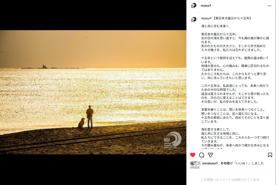 海と密接に関わるスポーツであるサーフィン。その中枢機関である日本サーフィン連盟は3月11日、「海と共に歩む未来へ。」と題したメッセージを発表した。